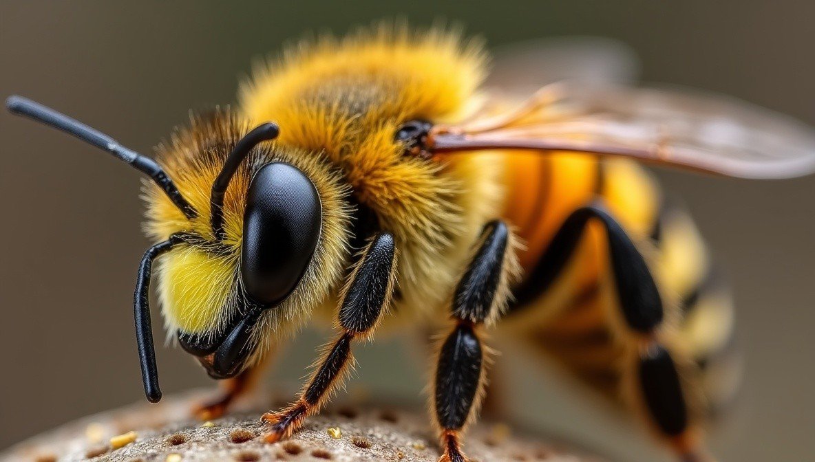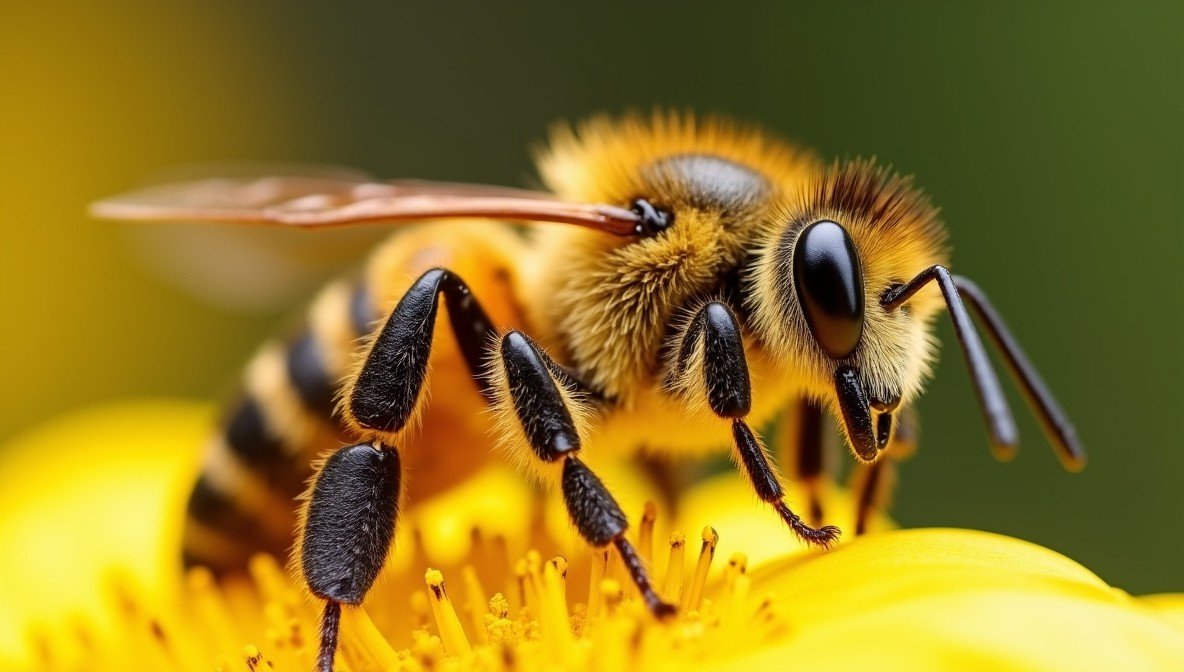 Пчела громко жужжит, перелетая с цветка на цветок.